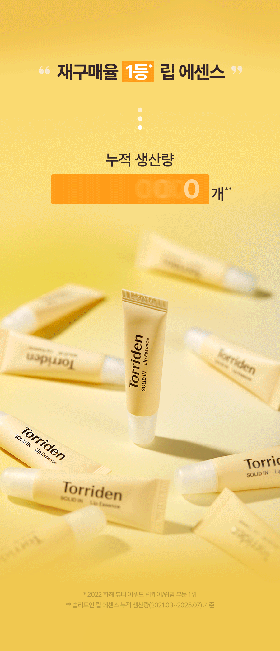 Product Information Provision Notice Table Dose or weight of the contents 11 ml / 0.37 fl. oz. Main specifications All skin types Usage date (or period of use after opening) Separately / 36 months (6 months after opening) How to use Apply to dry lips from time to time. Cosmetics manufacturers, cosmetics responsible vendors and customized cosmetics vendors Hansol Biotech Co., Ltd. / Torriden Co., Ltd. Manufacture Republic of Korea All ingredients that must be listed in accordance with the Cosmetics Act Polyisobutene, Petrolatum, Diisostearyl Malate, Jojoba Seed Oil, Shea Butter, Sorbitan Sesquioleate, Macadamia Seed Oil, Olive Oil, Baobab Seed Oil, Ceramide NP (1.215ppm), Ceramide NS, Ceramide AS, Ceramide EOP, Ceramide AP, Stearic Acid, Cholesterol, Vinegar, Sodium Hyaluronate, Panthenol, Trehalose, Hydrogenated Lecithin, Microcrystalline Wax, Toth Extract, Glycerin, Butylene Glycol, Purified Water, Caprylic/Capric Triglyceride, 1,2-Hexanediol (Cellmizing Lip Essence) Polyisobutene, Diisostearyl Malate, Dibutyl Adipate, Jojoba Seed Oil, Olive Oil, Petrolatum, Dipropylene Glycol, Microcrystalline Wax, Shea Butter, Macadamia Seed Oil, Candelilla Wax, Adenosine, Glycerin, Sorbitan Sesquioleate, Pentylene Glycol, Tocopheryl Acetate, Collagen, Collagen Amino Acid, Collagen Extract, Soluble Collagen, Hydrolyzed Collagen (20ppb), Hexapeptide-2, Acetylhexapeptide-8, Cyanocobalamin, Chichi Root Extract, Niacinamide, Top Extract, Butylene Glycol, Caprylyl Glycol, Purified Water, Biotin, 1,2-Hexanediol Functional cosmetics food and medicine safety department examination Functional cosmetics examination (or report) in accordance with the Cosmetics Act Precautions when using A. When using cosmetics or after using them, consult a specialist if there are any abnormal symptoms or side effects such as red spots, swelling, or BRAND 1 syndrome in the area of use due to direct sunlight. B. Refrain from using cosmetics on areas with wounds C. Precautions for storage and handling 1) Keep out of reach of children 2) Keep out of direct sunlight Quality Assurance Standards If there is a defect in this product, we will compensate you according to the ‘Consumer Dispute Resolution Standards’ announced by the Fair Trade Commission. Consumer Counseling Phone Number 1600-3584