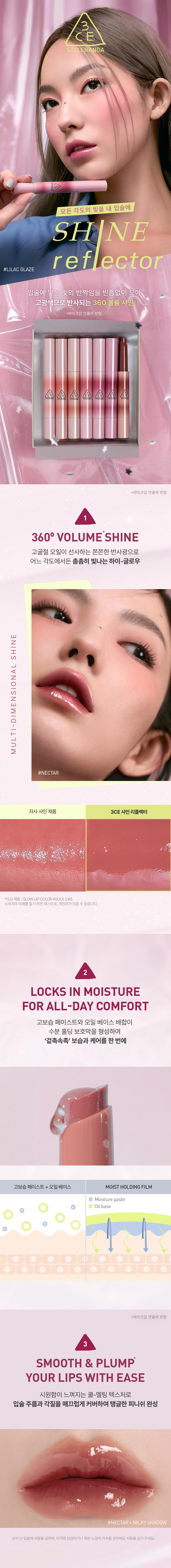 All ingredients that must be listed in accordance with the Cosmetics Act 3CE SHINE Reflector #넥타 Bis-Behenyl/Isostearyl/Phytoscheryl Dimer Dylinoleil Dimer Dailinolinate, Diisostearyl Malate, Polyglyceryl-2 Triisostearate, Bis-Diglyceryl Polyacyl Adipate-2, Synthetic Wax, Hydrogenated Polyisobutene, Octyldodecanol, Menthylactate, Sorbitan Isostearate, Cetyl PEG/10/1 Dimethicone, Pentylene Glycol, Red Iron Oxide (CI 77491), Caprylyl Glycol, Disteadimonium Hectorite, Black Iron Oxide (CI 77499), Fragrance, Titanium Dioxide (CI 77891), Ethylene/Propylene Copolymer, Red 202호 (CI 15850), Propylene Carbonate 3CE Shine Reflector #라일락 Glazed Bis-Behenyl/Isostearyl Dimer Dylinole Dimer Dilinoleate, Diisostearyl Malate, Polyglyceryl-2 Triisostearate, Bis-Diglyceryl Polyacyl Adipate-2, Synthetic Wax, Hydrogenated Polyisobutene, Octyldodecanol, Menthyl Lactate, Sorbitan Isostearate, Cetyl PEG/FIG-10/1 Dimethicone, Pentylene Glycol, Titanium Dioxide (CI 77891), Caprylyl Glycol, Yellow 4호 (CI 19140), Distearidimonium Hectorite, Fragrance, Red 202호 (CI 15850), Ethylene/Propylene Copolymer, Propylene Carbonate, Blue 1호 (CI 42090), Black Iron Oxide (CI 77499) 3CE Shine Reflector #레인 Orshine Bis-Behenyl/Isostearyl / Phytoscheryl Dimer Dilinoleate, Diisostearyl Malate, Polyglyceryl-2 Triisostearate, Bis-Diglyceryl Polyacyl Adipate-2, Synthetic Wax, Hydrogenated Polyisobutene, Octyldodecanol, Menthyl Lactate, Sorbitan Isostearate, Cetyl PEG/FIG-10/1 Dimethicone, Pentylene Glycol, Caprylyl Glycol, Titanium Dioxide (CI 77891), Distearimonium Hectorite, Yellow 5호 (CI 15985), Fragrance, Ethylene / Propylene Copolymer, Red 202호 (CI 15850), Propylene Carbonate, Black Iron Oxide (CI 77499) 3CE Shine Reflector #밀키 Shadow Bis-Behenyl/Isostearyl/Phytoscheryl Dimer Dilinoleil, Dilinoleil Dimer, Diisostearyl Malate, Polyglyceryl-2 Triisostearate, Bis-Diglyceryl Polyacyl Adipate-2, Synthetic wax, hydrogenated polyisobutene, octyldodecanol, mentyl lactate, sorbitan isostearate, cetyl peg/pfig-10/1 dimethicone, pentylene glycol, titanium dioxide (CI 77891), caprylyl glycol, distearimonium hectolite, red iron oxide (CI 77491), fragrance, ethylene/propylene copolymer, black iron oxide (CI 77499), propylene carbonate, yellow 5호 (CI 15985), red 202호 (CI 15850) 3CE SHINE reflector #소프티스트 bis-behenyl/isostearyl/phytoscheryl dimer dilinoleate, diisostearyl malate, Polyglyceryl-2 Triisostearate, Bis-Diglyceryl Polyacyladipate-2, Synthetic Wax, Hydrogenated Polyisobutene, Octyldodecanol, Menthyl Lactate, Sorbitan Isostearate, Cetyl PEG/PFG-10/1 Dimethicone, Pentylene Glycol, Titanium Dioxide (CI 77891), Caprylyl Glycol, Disteadimonium Hectorite, Fragrance, Ethylene/Propylene Copolymer, Red Iron Oxide (CI 77491), Propylene Carbonate, Yellow 5호 (CI 15985), Red 202호 (CI 15850), Black Iron Oxide (CI 77499) 3CE Shine Reflector #오팔 Shower Bis-Behenyl/Isostearyl/Phytosteryl Dimer Dilinoleinoleate, Diisostearyl Malate, Polyglyceryl-2 Triisostearate, Bis-Diglyceryl Polyacyl Adipate-2, Synthetic Wax, Hydrogenated Polyisobutene, Octyldodecanol, Mentyl Lactate, Sorbitan Isostearate, Cetyl PEG/PPG-10/1 Dimethicone, Pentylene Glycol, Titanium Dioxide (CI 77891),Caprylyl Glycol,Calcium Aluminum Borosilicate,Distearimonium Hectorite,Fragrance,Ethylene/Propylene Copolymer,Propylene Carbonate,Yellow 5호 (CI 15985),Red Iron Oxide (CI 77491),Black Iron Oxide (CI 77499),Red 202호 (CI 15850),Tin Oxide 3CE Shine Reflector #콜디스트 Bis-Behenyl/Isostearyl/Phytoscheryl Dimer Dilinoleil Dimer Dimer Dilinolinate, Diisostearyl malate, polyglyceryl-2 triisostearate, bis-diglyceryl polyacyladipate-2, synthetic wax, hydrogenated polyisobutene, octyldodecanol, mentyl lactate, sorbitan isostearate, cetyl pegg/pfig-10/1 dimethicone, pentylene glycol, caprylyl glycol, red iron oxide (CI 77491), distearidimonium hectolite, titanium dioxide (CI 77891), red 202호 (CI 15850), fragrance, ethylene/propylene copolymer, propylene carbonate, Blue 1호 (CI 42090), Black Iron Oxide (CI 77499)