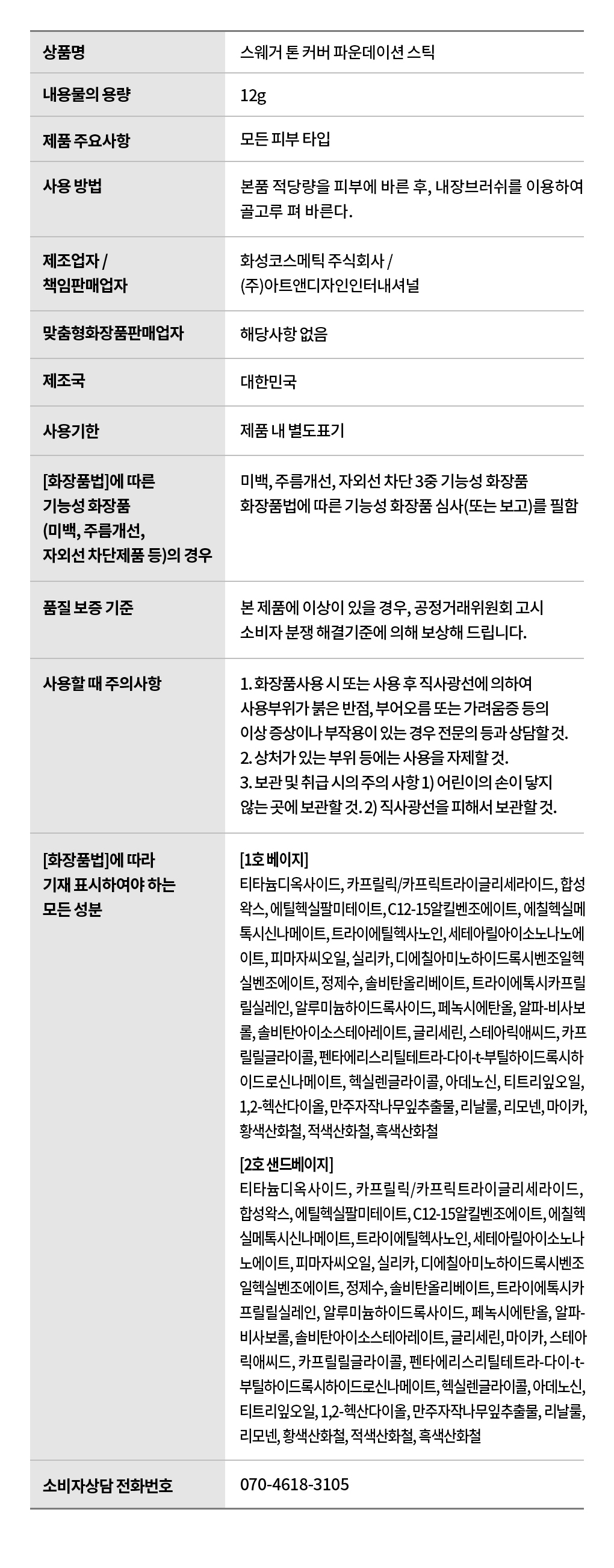 All ingredients that must be listed in accordance with the Cosmetics Act (1호 Beige) Titanium Dioxide, Caprylic/Capric Triglyceride, Synthetic Wax, Ethylhexyl Palmitate, C12-15 Alkyl Benzoate, Ethylhexyl Methoxycinnamate, Triethylhexanoin, Cetearyl Isononanoate, Castor Seed Oil, Silica, Diethylaminohydroxybenzoyl Hexylbenzoate, Purified Water, Sorbitan Olivete, Triethoxycaprylyl Silane, Aluminum Hydroxide, Phenoxyethanol, Alpha-Bisabolol, Sorbitan Isostearate, Glycerin, Stearic Acid, Caprylyl Glycol, Pentaerythrityl Tetra-Di-t-Butyl Hydroxyhydrocinnamate, Hexylene Glycol, Adenosine, Tea Tree Leaf Oil, 1,2-Hexanediol, Manchurian Birch Leaf Extract, Linalool, Limonene, Mica, Yellow Iron Oxide, Red Iron Oxide, Black Iron Oxide (2호 Sand Beige) Titanium Dioxide, Caprylic/Capric Triglyceride, Synthetic Wax, Ethylhexyl Palmitate, C12-15 Alkyl Benzoate, Ethylhexyl Methoxycinnamate, Triethylhexanoin, Cetearyl Isono Nanoate, Castor Seed Oil, Silica, Diethylaminohydroxybenzoylhexylbenzoate, water, sorbitan olivate, triethoxycaprylyl silane, aluminum hydroxide, phenoxyethanol, alpha-bisabolol, sorbitan isostearate, glycerin, mica, stearic acid, caprylyl glycol, pentaerythrityl tetra-di-t-butyl hydroxyhydrocinnamate, hexylene glycol, adenosine, tea tree leaf oil, 1,2-hexanediol, Manchurian birch leaf extract, linalool, limonene, yellow iron oxide, red iron oxide, black iron oxide
