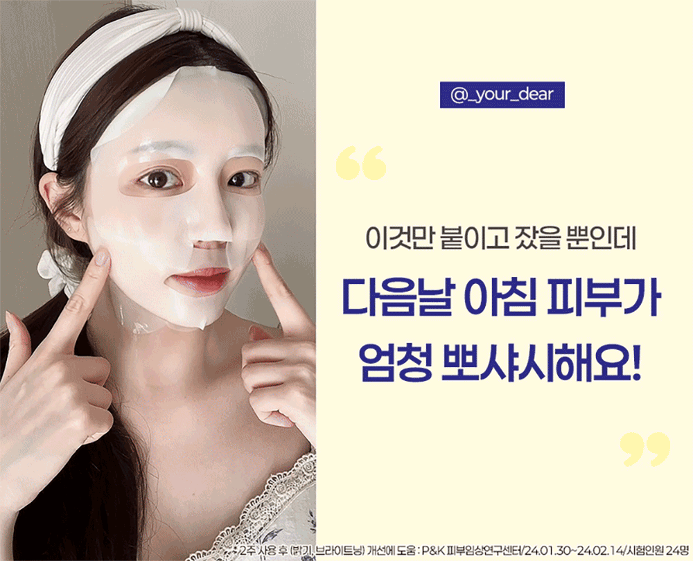 Product Information Provision Notice Table Dose or weight of the contents 34g Main specifications All skin types Usage date (or period of use after opening) 3 years from date of manufacture How to use (1) After cleansing, adjust the skin texture with toner, then take out the mask separated from the top and bottom to remove the film. (2) Stick the top with the eyes as the center and the bottom with the mouth as the center, according to the face. (3) Depending on the skin condition, the active ingredients are absorbed and become transparent after about 30 minutes. *It may take more than 40 minutes depending on your skin condition. (4) When the mask becomes transparent, remove it and tap the remaining contents with your hand to absorb RYO Cosmetics manufacturers, cosmetics responsible vendors and customized cosmetics vendors Miin Lee / Chong Kun Dang Health Manufacture Republic of Korea All ingredients that must be listed in accordance with the Cosmetics Act Purified water, glycerin, dipropylene glycol, cetyl ethylhexanoate, niacinamide, carob gum, betaine, irish moss, irish moss powder, hydroxyacetophenone, panthenol, glyceryl stearate, PEG-100 stearate, caprylyl glycol, cellulose gum, shea butter, potassium chloride, sodium polyacrylate, polysorbate 60, hydrogenated polydecene, Sucrose, Algin, Adenosine, Gardenia Extract, Hydrolyzed Sponge, Sphingomonas Ferment Extract, Hydrolyzed Hyaluronic Acid, Trideseth-6, Propanediol, Hydroxyethyl Acrylate/Sodium Acryloyl Dimethyl Taurate Copolymer, Pantoractone, Ethylhexylglycerin, Butylene Glycol, Bergamot Oil, Maltodextrin, Dipotassium Glycyrrhizate, 1,1 2-Hexanediol, Orange Peel Oil, Centella Asiatica Extract, Magnesium Ascorbyl Phosphate, Ascorbyl Glucoside, Sodium Ascorbyl Phosphate, 3-O-Ethyl Ascorbic Acid, Ascorbyl Tetraisopalmitate, Ascorbic Acid, Lemon Peel Oil, Sorbitan isostearate, loquat leaf extract, arbutin, tranexamic acid, sodium hyaluronate, spearmint extract, hydrogenated phosphatidylcholine, caprylic/capric triglyceride, sucrose stearate, tocopherol, madecasic acid, asiaticoside, glutathione, asiatic acid, cholesterol, madecassoside, potassium hyaluronate, hydrolyzed sodium hyaluronate, Hyaluronic Acid, DAISO Lithium EDTA, Limonene Water, Glycerin, Dipropylene Glycol, Cetyl Ethylhexanoate, Niacinamide, Ceratonia Siliqua (Carob) Gum, Betaine, Chondrus Crispus, Chondrus Crispus Powder, Hydroxyacetophenone, Panthenol, Glyceryl Stearate, PEG-100 Stearate, Caprylyl Glycol, Cellulose Gum, Butyrospermum Parkii (Shea) Butter, Potassium Chloride, Sodium Polyacrylate, Polysorbate 60, Hydrogenated Polydecene, Sucrose, Algin, Adenosine, Gardenia Florida Fruit Extract, Hydrolyzed Sponge, Sphingomonas Ferment Extract, Hydrolyzed Hyaluronic Acid, Trideceth-6, Propanediol, Hydroxyethyl Acrylate/Sodium Acryloyldimethyl Taurate Copolymer, Pantolactone, Ethylhexylglycerin, Butylene Glycol, Citrus Aurantium Bergamia (Bergamot) Fruit Oil, Maltodextrin, Dipotassium Glycyrrhizate, 1, 2-Hexanediol, Citrus Aurantium Dulcis (Orange) Peel Oil, Centella Asiatica Extract, Magnesium Ascorbyl Phosphate, Ascorbyl Glucoside, Sodium Ascorbyl Phosphate, 3-O-Ethyl Ascorbic Acid, Ascorbyl Tetraisopalmitate, Ascorbic Acid, Citrus Limon (Lemon) Peel Oil, Sorbitan Isostearate, Eriobotrya Japonica Leaf Extract, Arbutin, Tranexamic Acid, Sodium Hyaluronate, Mentha Viridis (Spearmint) Extract, Hydrogenated Phosphatidylcholine, Caprylic/Capric Triglyceride, Sucrose Stearate, Tocopherol, Madecassic Acid, Asiaticoside, Glutathione, Asiatic Acid, Cholesterol, Madecassoside, Potassium Hyaluronate, Hydrolyzed Sodium Hyaluronate, Hyaluronic Acid, Disodium EDTA, Limonene Functional cosmetics food and medicine safety department examination Functional cosmetics examination (or report) in accordance with the Cosmetics Act Precautions when using 1) When using cosmetics or after use, consult a specialist if you have any abnormal symptoms or side effects such as red spots, swelling, or BRAND 1 syndrome in the area of use due to direct sunlight 2) Refrain from using it on areas with wounds 3) Precautions for storage and handling A) Keep out of reach of children B) Keep out of direct sunlight Quality Assurance Standards This product can be exchanged or compensated in accordance with the consumer dispute resolution standards notified by the Fair Trade Commission. Consumer Counseling Phone Number 1855-3308