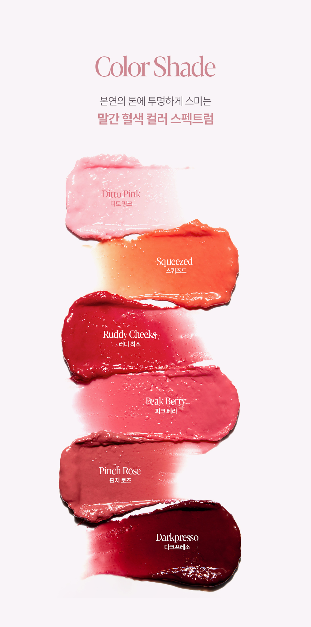 하이드로제네이티드폴리아이소부텐, 다이아이소스테아릴말레이트, 하이드로제네이티드캐스터오일다이머다이리놀레에이트, 비스-다이글리세릴폴리아실아디페이트-2, 카프릴릭/카프릭트라이글리세라이드, 합성왁스, 폴리글리세릴-2트라이아이소스테아레이트, 시어버터, 실리카다이메틸실릴레이트, 옥틸도데칸올, 에틸렌/프로필렌코폴리머, 폴리아마이드-8, 칸데릴라왁스, 시어버터불검화물, 폴리하이드록시스테아릭애씨드, 티타늄디옥사이드 (CI 77891), 다이메티콘, 향료, 레시틴, 에틸헥실팔미테이트, 아이소스테아릭애씨드, 아이소프로필미리스테이트, 락틱애씨드, 폴리글리세릴-3폴리리시놀리에이트, 적색223호, 정제수, 적색202호, 적색226호, 펜타에리스리틸테트라-다이-T-부틸하이드록시하이드로신나메이트, 락토바실러스발효용해물, 아스코빅애씨드, 토코페롤, 프로판다이올, 글리세린, 아라비아고무나무검, 울금뿌리추출물, 말토덱스트린, 1,2-헥산다이올, 에틸헥실글리세린02 스퀴즈드