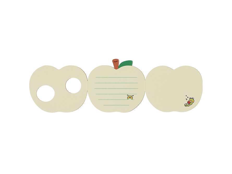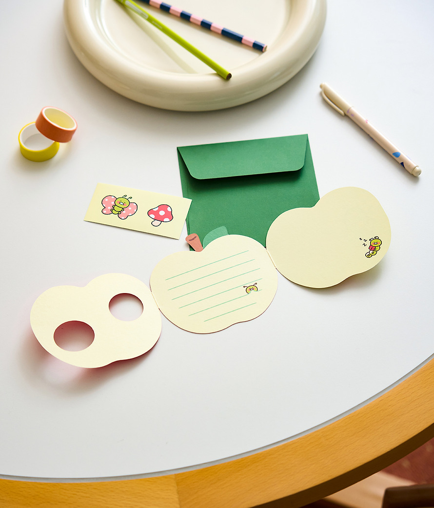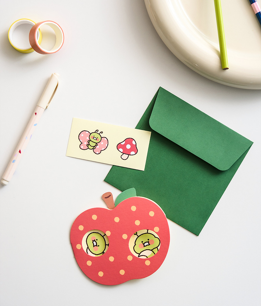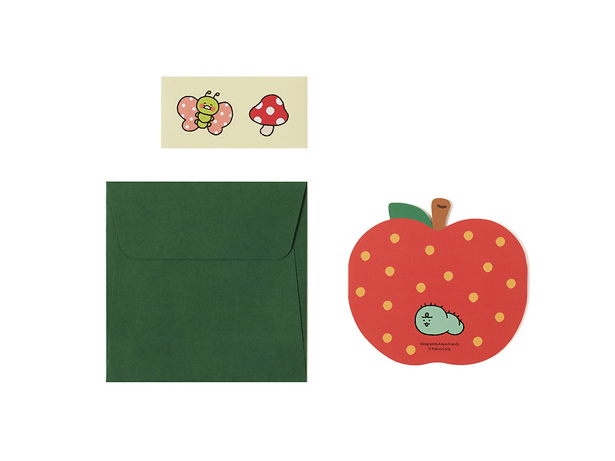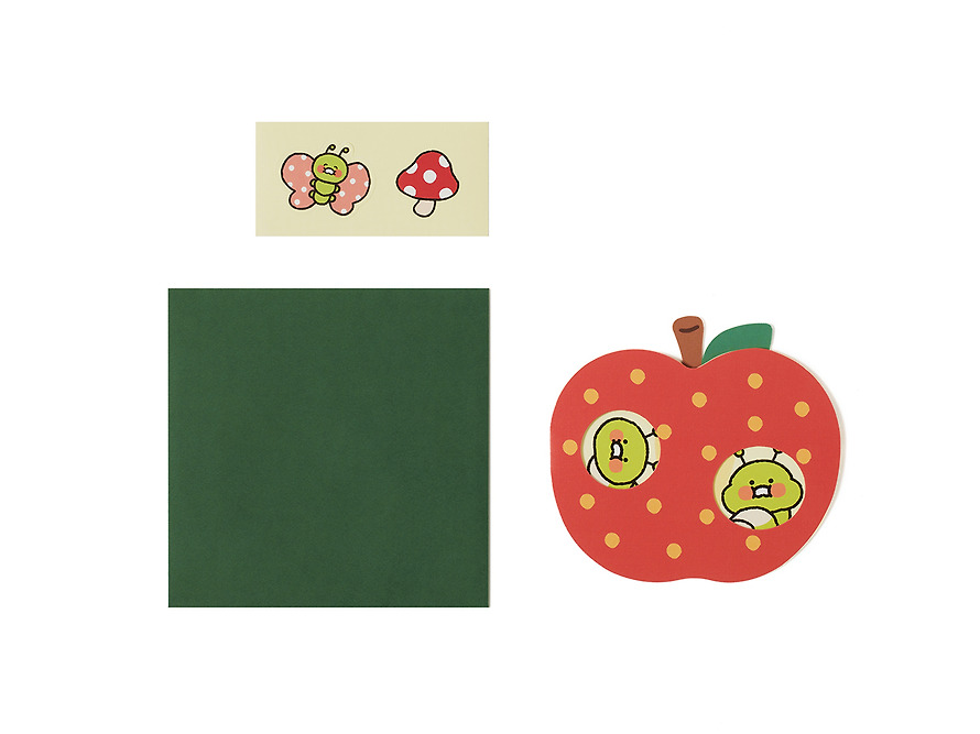 It’s a rich set of fresh apple-shaped cards 1๋งค, envelopes 1๋งค, and two butterfly and mushroom stickers, making it easy to convey your feelings to your loved ones.