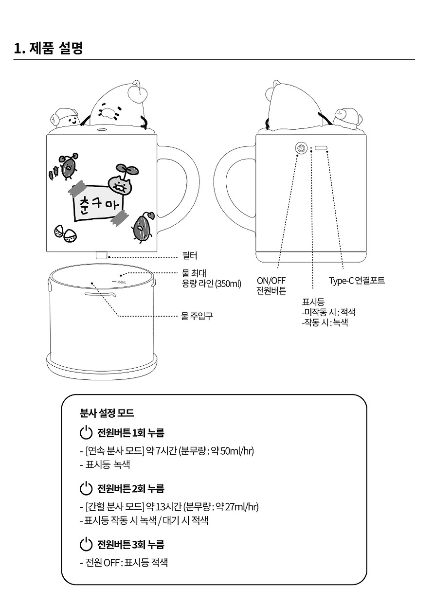 – Components: Humidifier main product, 2 filters, USB-C type cable, manual