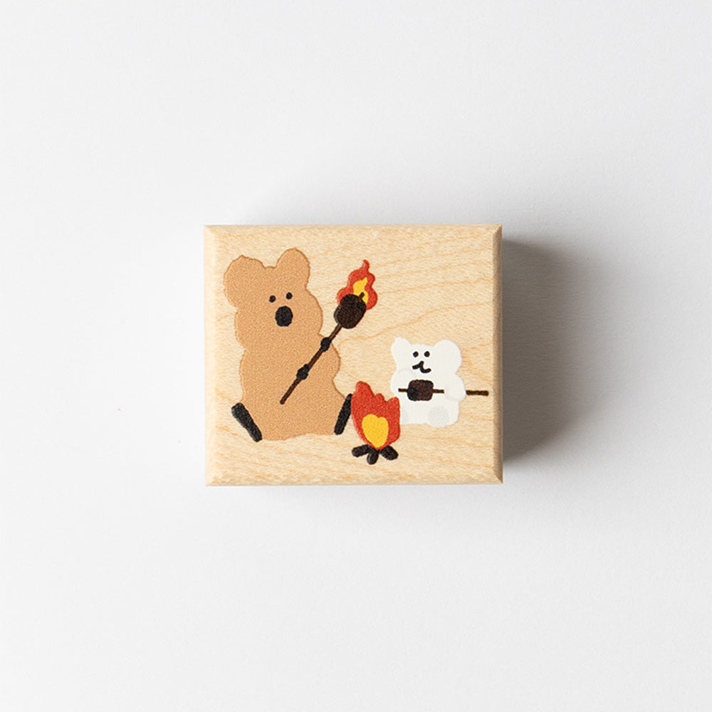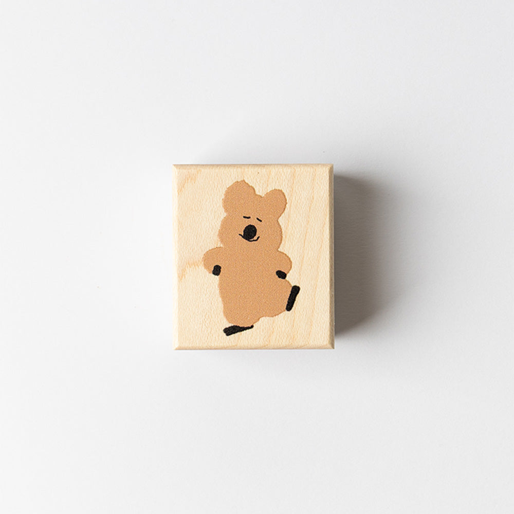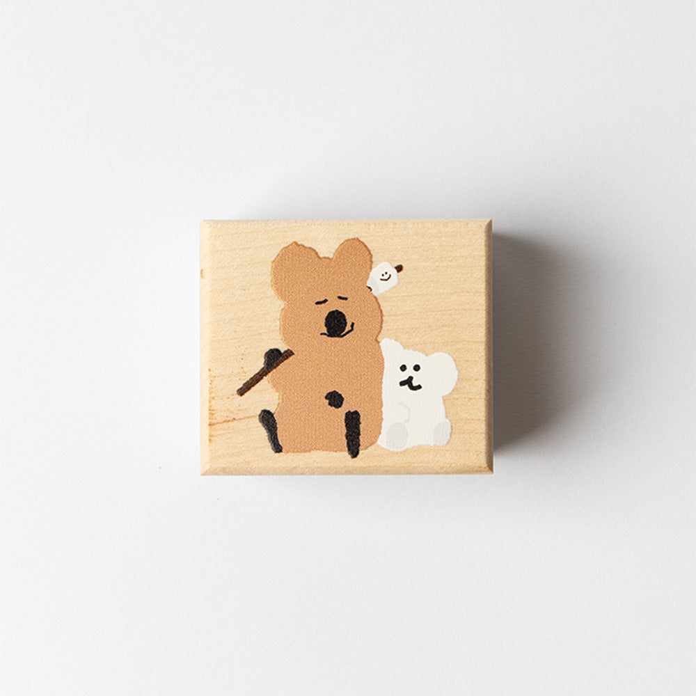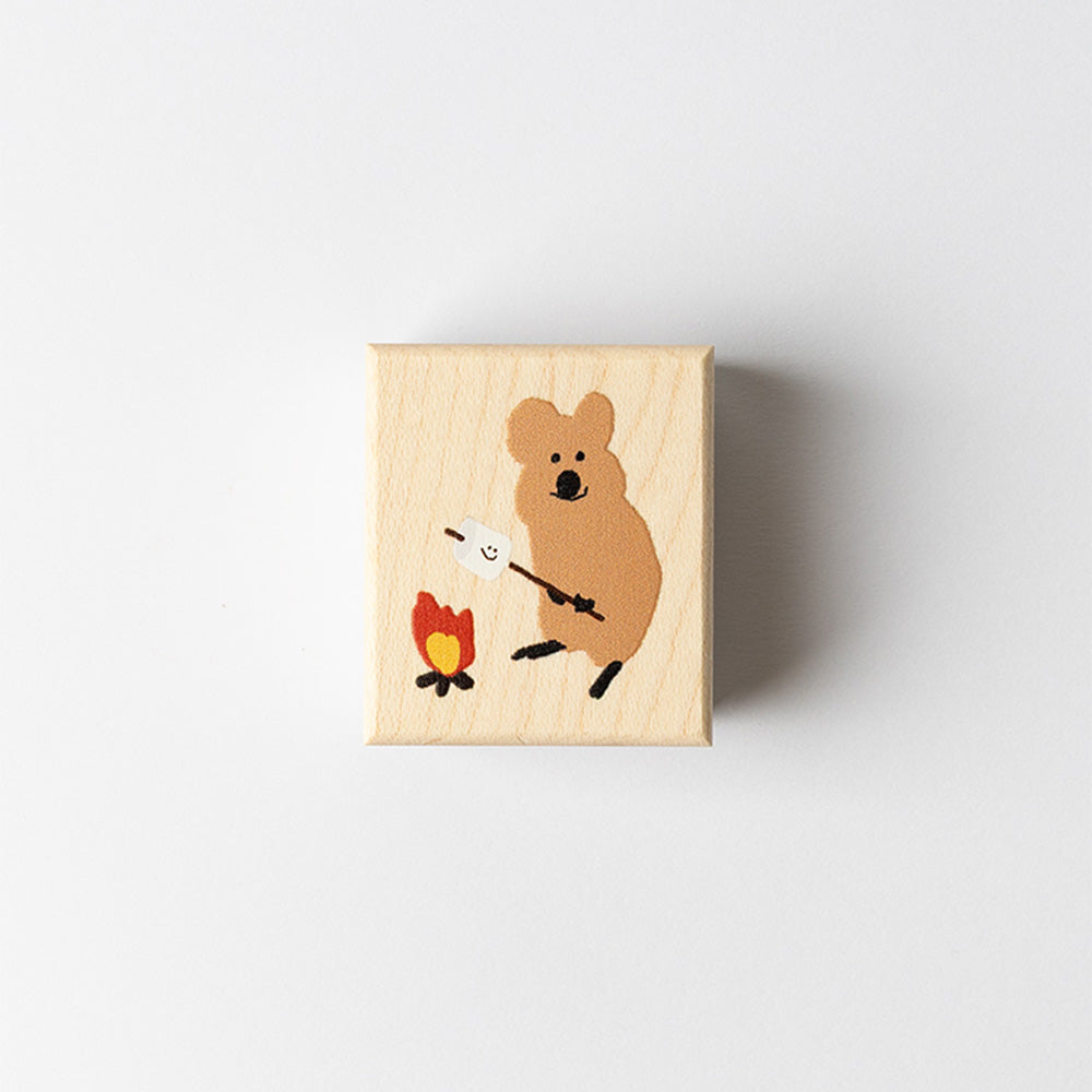 A square wood stamp made from maple wood, featuring a design of QUOKKA & BOBO on the back.