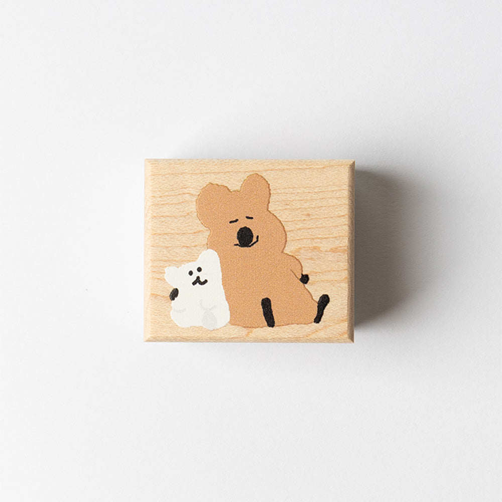 A square wood stamp made from maple wood, featuring a design of QUOKKA & BOBO on the back.
