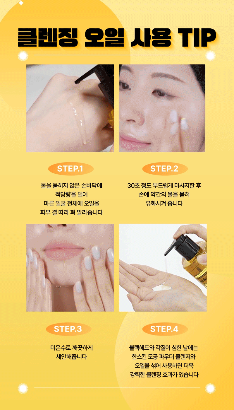 Product Information Provision Notice Table Dose or weight of the contents Oil300ml+Oil30ml Main specifications ■ Suitable for all skin types Usage date (or period of use after opening) 36 months from date of manufacture (use within 12 months of opening) How to use 1. Dispense an appropriate amount into the palm of your hand that is not soaked in water and spread the oil along the skin texture over the entire dry face. 2. Massage gently for about 30 seconds, then apply a little water to your hands and massage again. 3. Massage intensively into areas where blackheads are a problem. 4. Cleanse your face with lukewarm water. Cosmetics manufacturers, cosmetics responsible vendors and customized cosmetics vendors (AHA/BHA) ■ Green Course Co., Ltd. / Celltrion Skin Cure Co., Ltd. (PHA) ■ Cosmeca Korea Co., Ltd. / Celltrion Skin Cure Co., Ltd. Manufacture Republic of Korea All ingredients that must be listed in accordance with the Cosmetics Act 1. Cleansing Oils AHA Ethylhexyl Palmitate, Sorbes-30 Tetraoleate, Caprylic/Capric Triglyceride, Olive Oil, Sunflower Seed Oil, Limonene, Sorbitan Sesquioleate, Candida Bombicola/Glucose/Methylleife Seadate Ferment, Drumstick Seed Oil, Caprylyl Glycol, Purified Water, Ethylhexylglycerin, Lemon Peel Oil, Orange Peel Oil, Citric Acid (110 ppm), Grapefruit Peel Oil, Hodong Seed Oil, Hydrolyzed Hyaluronic Acid, Meadowfoam Seed Oil, Jojoba Seed Oil, Grape Seed Oil, Tataric Acid (5 ppm), Tocopherol, Butylene Glycol, 1, 2-Hexanediol, Hydrogenated Lecithin, Cetearyl Alcohol, Glycine, Stearic Acid, Serine, Glutamic Acid, Spotted Pineapple Extract, Aspartic Acid, Leucine, Alanine, Lysine, Arginine, Tyrosine, Phenylalanine, Proline, Threonine, Valine, Isoleucine, Histidine, Cysteine, methionine, persimmon leaf extract, grape extract, safflower flower extract, coffee bean extract, yellow root root extract, green tea extract, chestnut bark extract, chobark fruit extract, ceramide NP, ceramide NS, charcoal powder, cholesterol, phytosphingosine, ceramide api, ceramide as, ceramide iop 2. Cleansing Oil BHA PEG-7 Glyceryl Cocoate, Purified Water, Cetyl Ethyl Hexanoate, Butylene Glycol, Limonene, Caprylyl Glycol, Polyglyceryl-2 Triisostearate, Ethylhexylglycerin, Lemon Peel Oil, Orange Peel Oil, Salicylic Acid (100 ppm), Grapefruit Peel Oil, Hodong Seed Oil, Green Tea Seed Oil, Meadowfoam Seed Oil, Jojoba Seed Oil, Grape Seed Oil, Candida Bombicola/Glucose/Methylleife Sea Date Ferment, Virginia Harvest Water, 1,2-Hexanediol, Jojoba Oil/Queensland Nut Oil Ester, Yellow Lotus Root Extract, Squalene, Shea Butter, Glycine, Phytosteryl Macadamiate, Serine, Glutamic Acid, Aspartic Acid, Leucine, Phytosterols, Alanine, Lysine, Arginine, Tyrosine, Phenylalanine, Proline, Threonine, Valine, Isoleucine, Histidine, Cysteine, Methionine, Persimmon Leaf Extract, Tocopherol, Grape Extract, Safflower Flower Extract, Coffee bean extract, Horn root extract, green tea extract, chestnut bark extract, Chopi tree fruit extract, charcoal powder 3. Cleansing Oils PHA Caprylic/Capric Triglyceride, PEG-8 Glyceryl Isostearate, Cetyl Ethyl Hexanoate, Polybutene, Isopropyl Palmitate, Ethylhexyl Palmitate, PEG-8 Isostearate, Water, Orange Peel Oil, Tocopheryl Acetate, Lemon Peel Oil, Tangerine Peel Oil, 1,2-Hexanediol, Butylene Glycol, Jojoba Seed Oil, Green Tea Seed Oil, Grape Seed Oil, Tea Tree Leaf Oil, Olive Oil, Aloe Vera Leaf Extract, Birch Sap, Camellia Flower Extract, Purslane Extract, Red Tree Chungyeong Extract, Maltobionic Acid (0.5 ppm), Phenoxyethanol, Ethylhexylglycerin, Oxygen, Limonene, Citral Functional cosmetics food and medicine safety department examination Not applicable Precautions when using 1) If you have any abnormal symptoms or side effects such as red spots, swelling, or RYO swelling in the area of use due to direct sunlight when using cosmetics or after use, consult a specialist 2) Refrain from using cosmetics on areas with wounds 3) Precautions for storage and handling A) Store out of reach of children B) Store away from direct sunlight 4. Do not use for children under 3 years old Quality Assurance Standards If there is a defect in this product, we will compensate you according to the “Consumer Dispute Resolution Standards” announced by the Fair Trade Commission Consumer Counseling Phone Number 080-456-2121