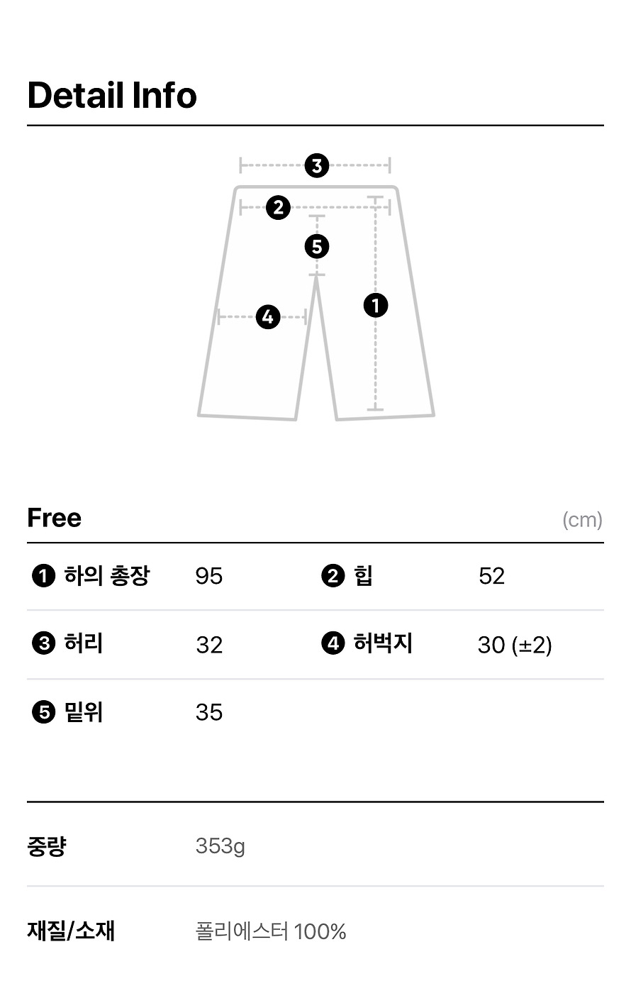 • Dimensions: (Waist) 32cm, (Full Length) 95cm, (Rise) 35cm, (Hip) 52cm, (Thigh) 30 (±2)cm, 353g