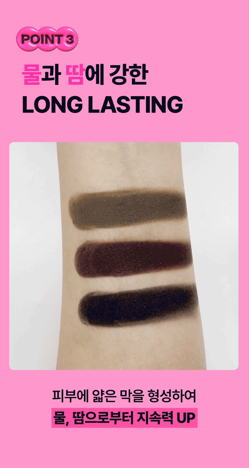 흑색산화철, 탤크, 합성플루오르플로고파이트, 다이카프릴릴카보네이트, 페닐트라이메티콘, 다이메티콘, 실리카, 라우로일라이신, 하이드로제네이티드폴리데센, 다이메티콘/비닐다이메티콘크로스폴리머, 카프릴릴글라이콜, 에틸헥실글리세린, 글리세릴카프릴레이트, 알루미늄하이드록사이드, 적색산화철, 황색산화철, 토코페롤, 정제수, 부틸렌글라이콜, 트라이메틸실록시실리케이트/다이메티콘올크로스폴리머, 트라이에톡시카프릴릴실레인, 라즈베리추출물, 1,2-헥산다이올, 검정콩추출물