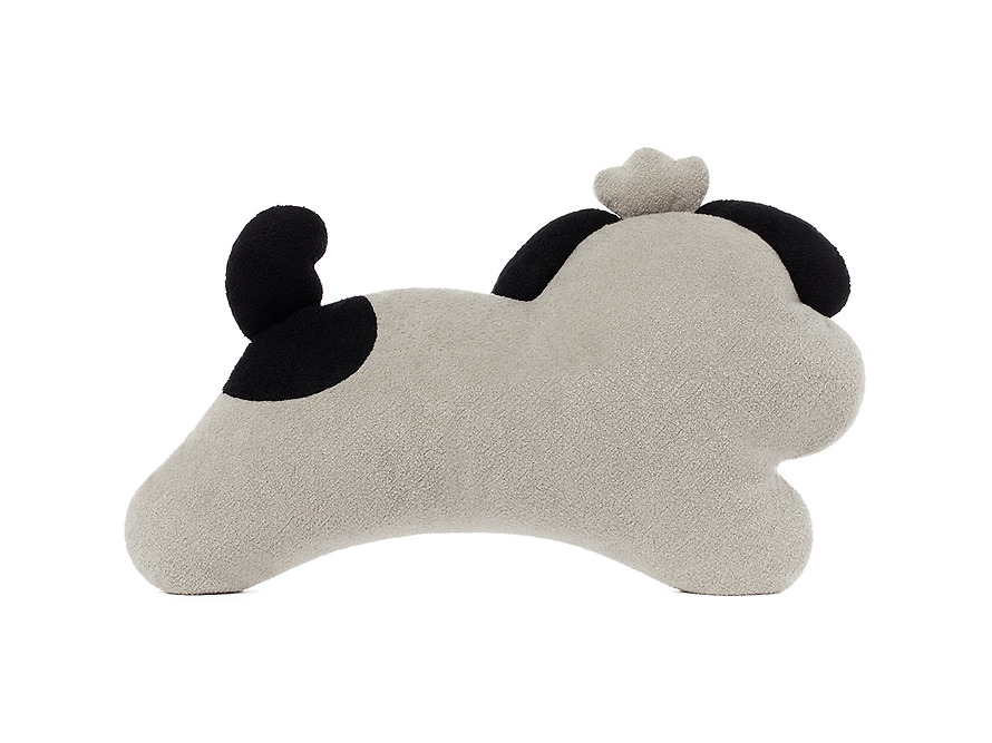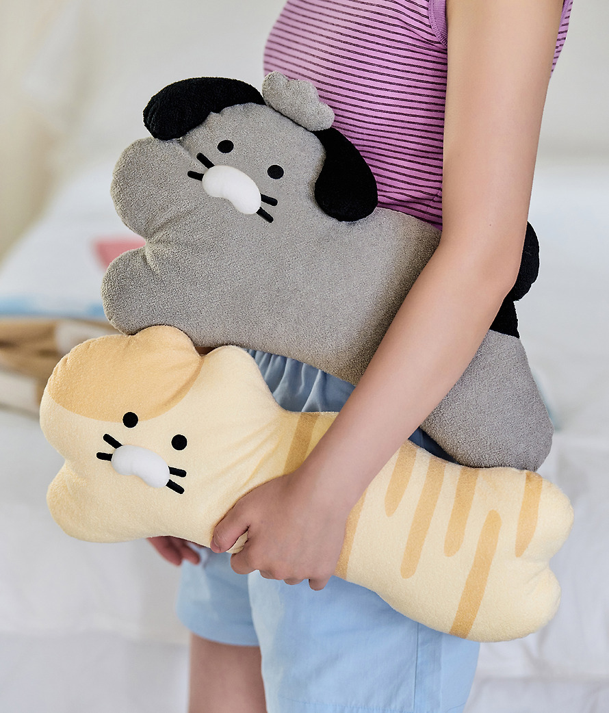 It has a long, flat shape that can be leaned or held like a pillow. 🖤
