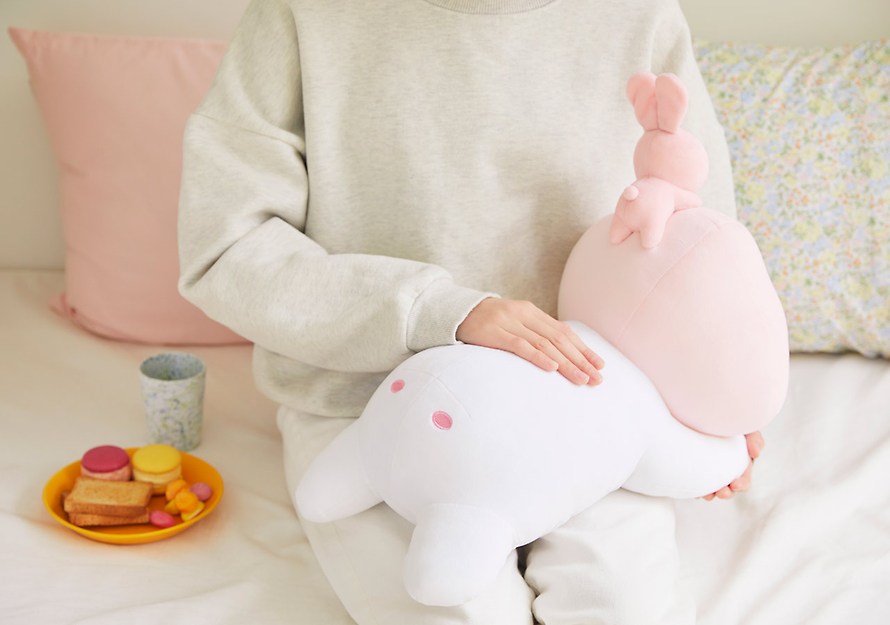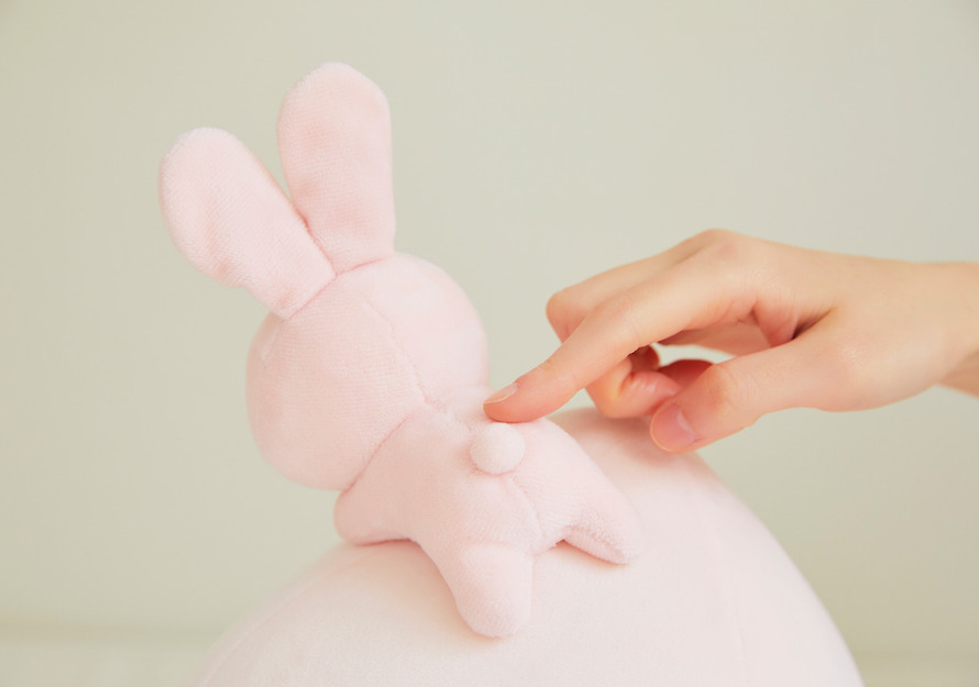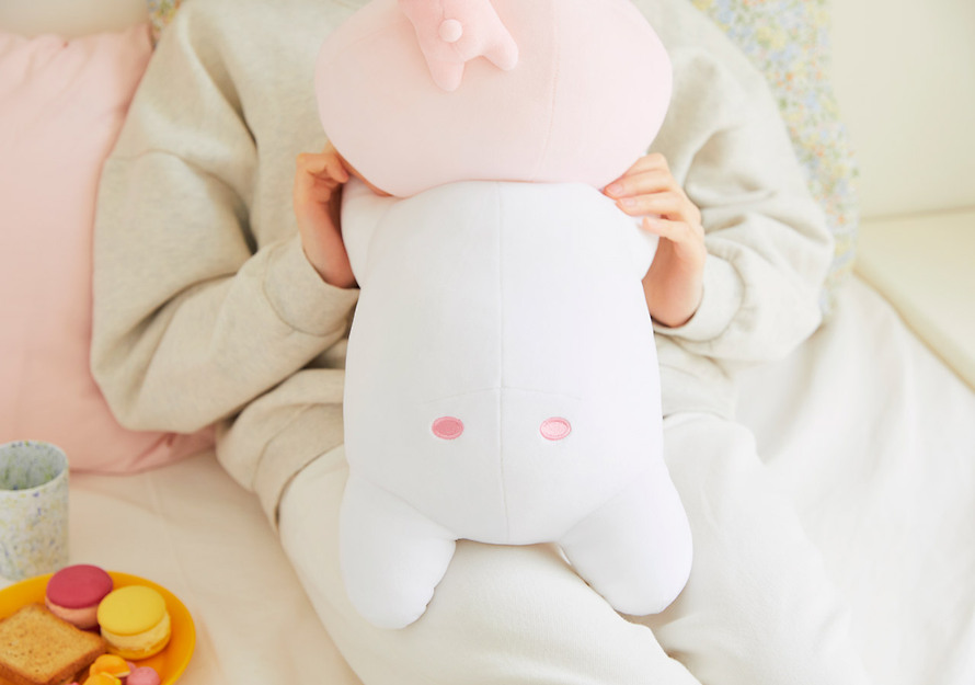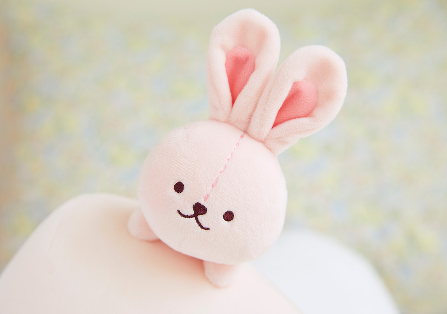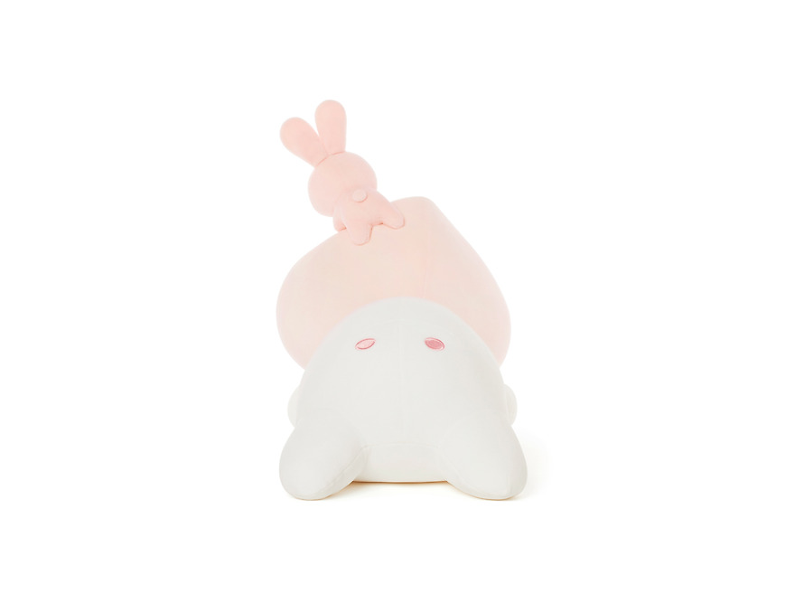 On top of the head of the soft little apeach is an adorable baby rabbit friend.