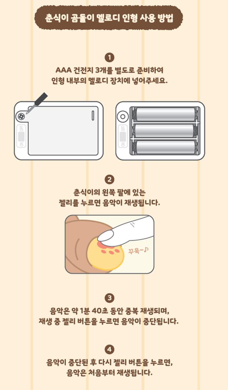 Open the back of Chunsik and insert 3 AAA batteries into the melody device.※ AAA batteries are not included.